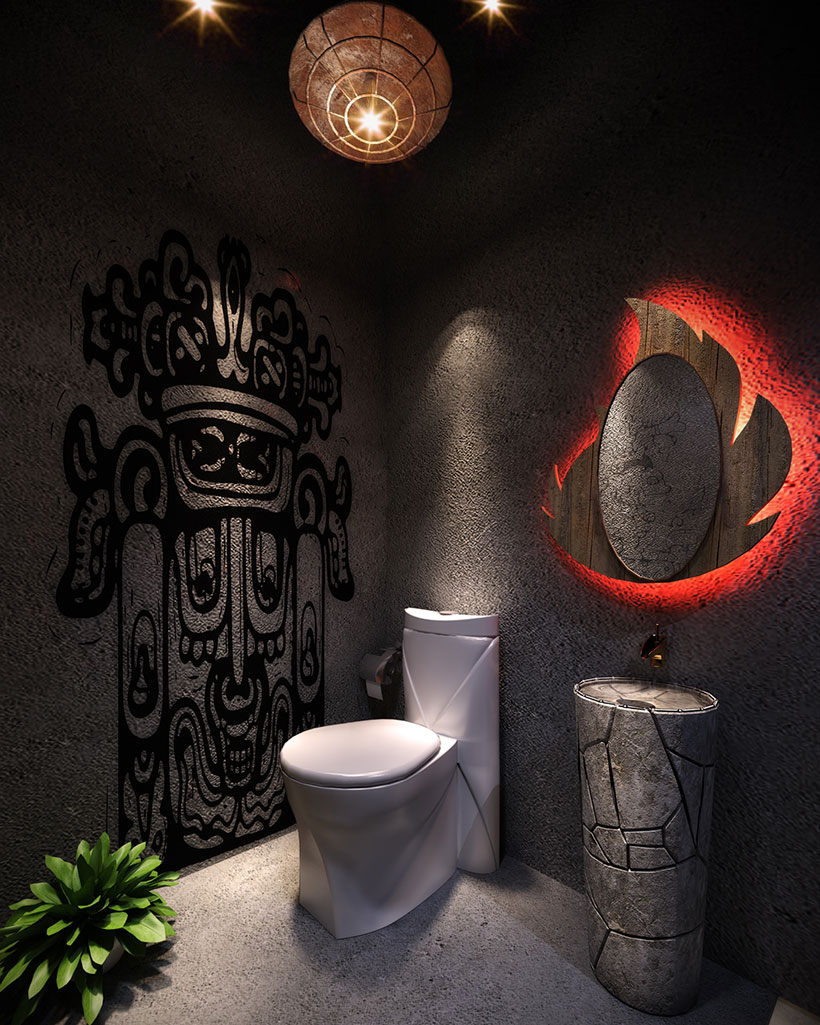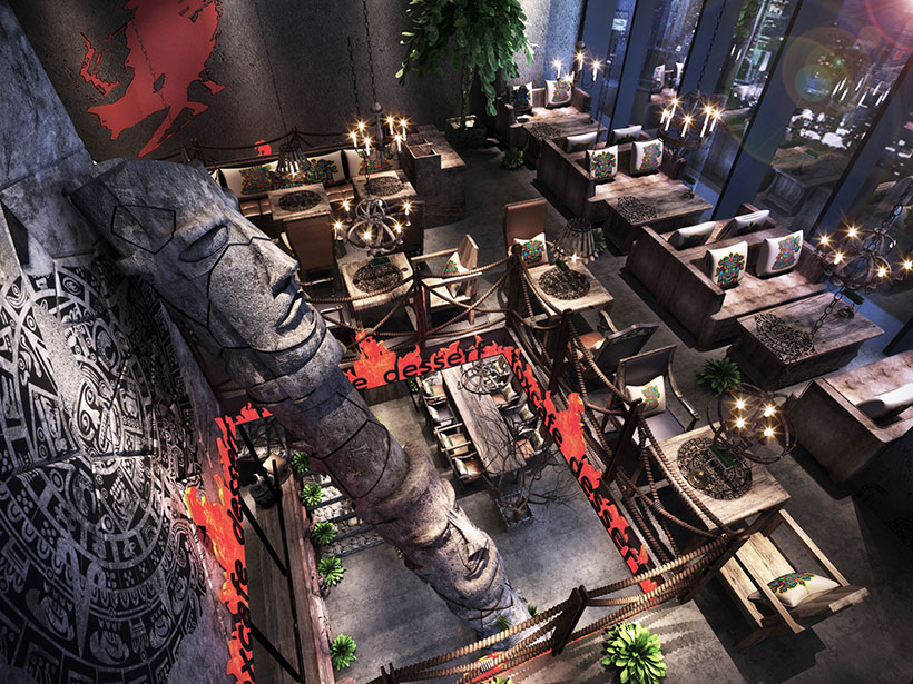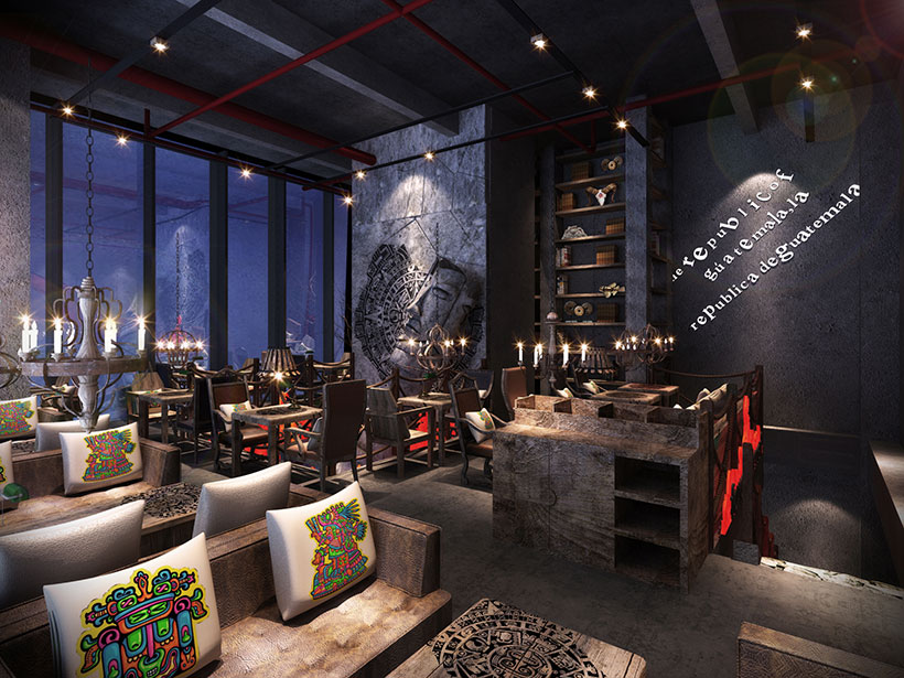 運(yùn)用破碎的瑪雅建筑紋理作為主元素貫穿整體空間設(shè)計(jì),將消失的瑪雅文化融入到現(xiàn)代主義的設(shè)計(jì)風(fēng)格里,用藝術(shù)化自然化的設(shè)計(jì)手法將簡陋的空間置換為國際潮流空間設(shè)計(jì)風(fēng)尚。設(shè)計(jì)師依舊沿襲 簡的理念,僅用一根從底層直穿二樓的人面雕塑就巧妙規(guī)避了空間的局促感,成為整體空間設(shè)計(jì) 凝練的一筆。