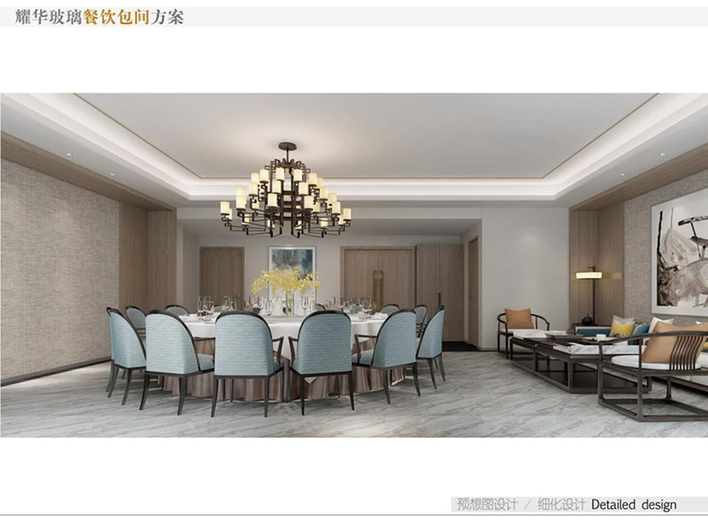 設計理念: 耀華玻璃餐飲包間裝修效果將現(xiàn)代與雅致的風格混搭。包間內采用柔和的燈光與精致的裝飾,營造出溫馨舒適的用餐氛圍。墻面選用高質量的裝飾玻璃,既美觀又實用,同時展現(xiàn)了耀華玻璃的產品特色,為顧客提供愉悅的用餐體驗。