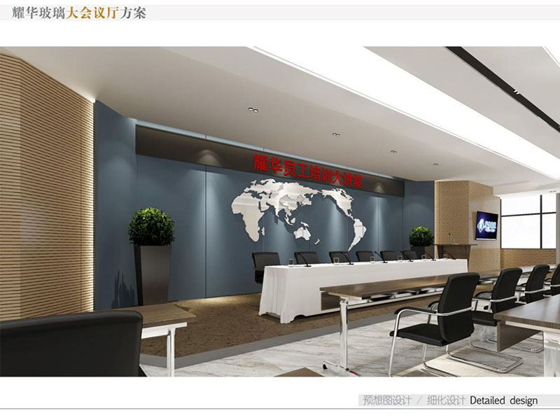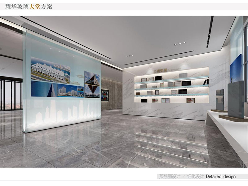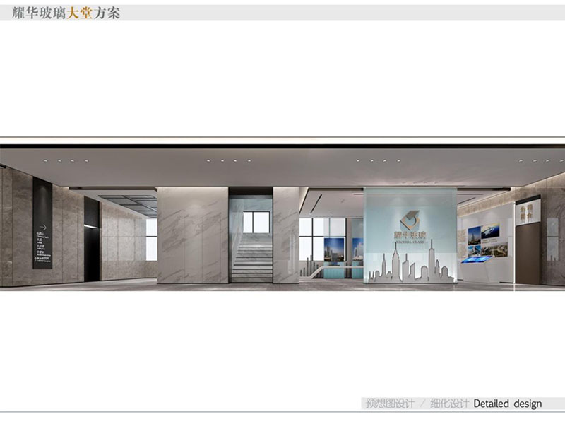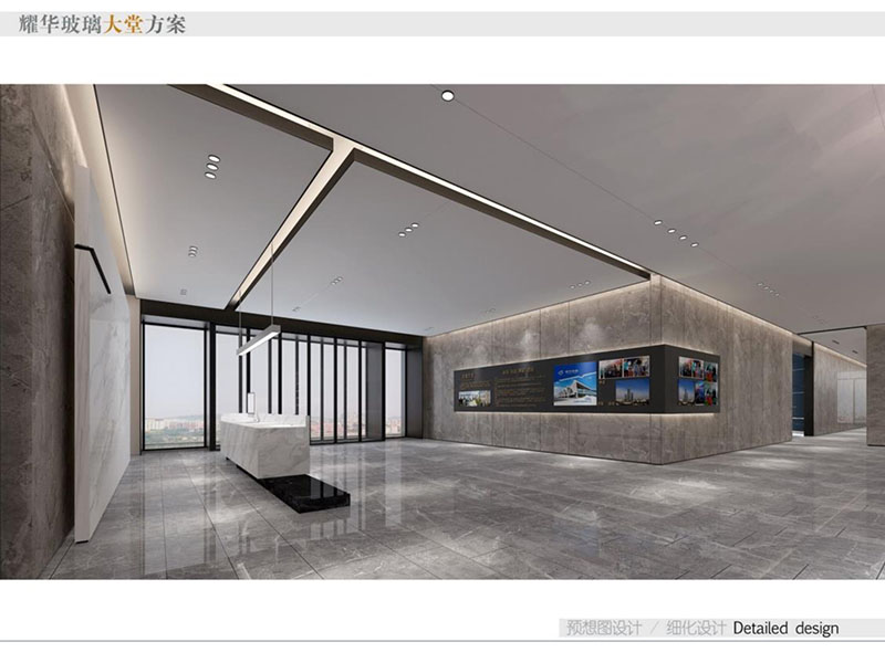 設(shè)計理念: 耀華玻璃大堂裝修效果彰顯出企業(yè)的大氣與現(xiàn)代感。在大堂內(nèi)樹立起一個耀華的標(biāo)志性展示,巧妙展示了耀華玻璃的工藝精髓。墻面與地面材質(zhì)選擇考究,與玻璃元素相得益彰,整體色調(diào)和諧統(tǒng)一,既展現(xiàn)了企業(yè)的專業(yè)形象,又營造出賓至如歸的溫馨氛圍。