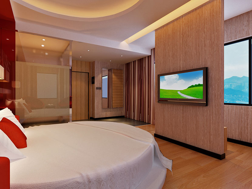 圓床房裝修效果獨特而浪漫,以圓形為主題設(shè)計。床頭背景墻采用柔和的色調(diào)與溫馨材質(zhì),利用鮮艷的紅色搭配軟包,圓形的床架搭配舒適的床墊與抱枕,不僅視覺上新穎別致,更提供了全方位的舒適體驗。房間內(nèi)燈光設(shè)計柔和,通過壁燈、臺燈以及可調(diào)光的主燈,營造出浪漫溫馨的氛圍,讓情侶們共度美好時光。整體裝飾簡潔而不失精致,每一處細(xì)節(jié)都透露著對浪漫與舒適的追求。